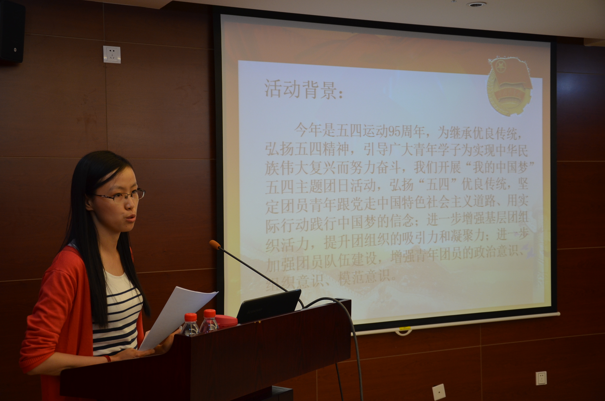 首先,由李一骁同学向同学们介绍了此次团日活动的主要目的,并向大家阐述了此次活动的意义。她说道:“今年是五四运动95周年,为继承优良传统,弘扬五四精神,引导广大青年学子为实现中华民族伟大复兴而努力奋斗,我院将开展以“激情五四,放飞中国梦”为主题的五四主题团日活动,弘扬“五四”优良传统,坚定团员青年跟党走中国特色社会主义道路、用实际行动践行中国梦的信念;进一步增强基层团组织活力,提升团组织的吸引力和凝聚力;进一步加强团员队伍建设,增强青年团员的政治意识、组织意识、模范意识。”