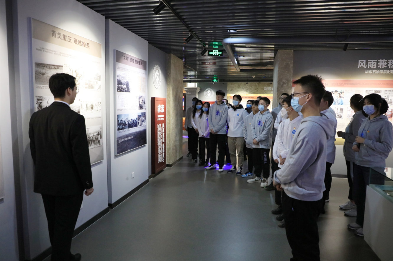 本安全第一党支部书记马明雨带领师生党员参观校史馆,重温学校六十八年的发展历程,重温了一代代中石大人在不同历史时期的使命与担当,学校在不同历史发展时期在人才培养和教学科研等方面的成功经验和杰出成就,边走边学,让学生党员重温学校与祖国海洋石油工业发展史同呼吸、与中国共产党砥砺奋进的峥嵘岁月共命运的波澜历史。同学们驻足在一张28年前的老照片前,这张照片里高德利、徐春明、张来斌三位中石大自己培养的“土生土长”的院士同框出现,“在这别具一格的“教室”里学习党史校史,传承前辈们的内在精神,让我们受益一生”,安全工程2020级本科生张馨予表示。