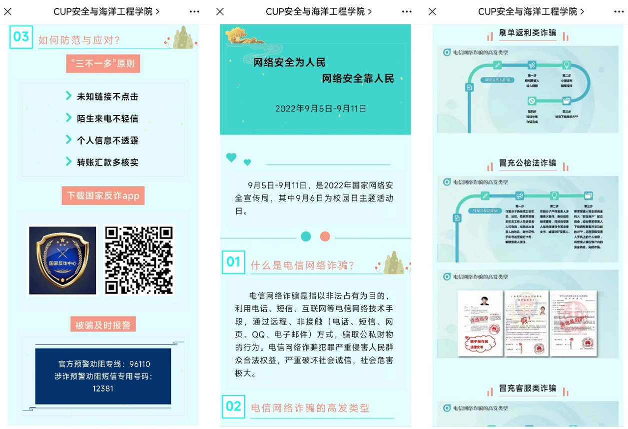 安全与海洋工程学院将网络安全宣传周及校园日有关活动纳入秋季学期安全教育,把师生反诈教育列为常态化重点工作,充分调动学生积极性、主动性和创造性,助力提升广大师生网络安全意识和防护技能,持续增强老师和同学们的网络安全意识和能力。