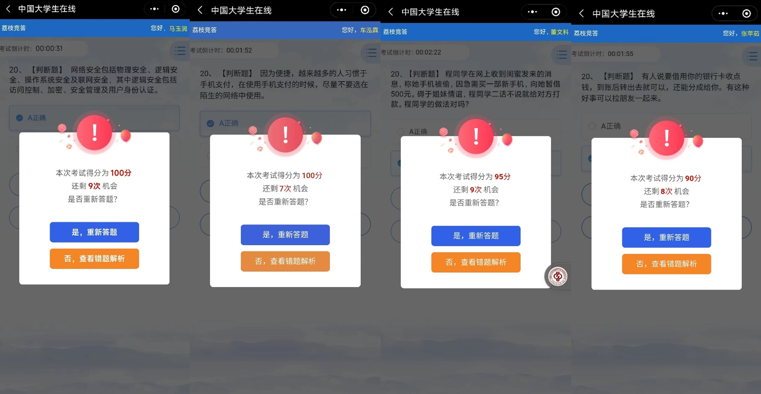 安全学院动员广大同学参与 “守护青春网络有你”全国大学生网络安全知识答题活动,通过线上答题方式普及网络安全知识,提高大学生防范网络诈骗、安全使用网络的能力。安全学院研究生张瑞峰说,“通过参与网络安全知识答题,让我对网络安全有了更深的感受。现代科技发展日新月异,但网络给我们带来便利的同时,也带来了巨大的风险,诸如:网贷、钓鱼WIFI、恶意软件等网络陷阱给人们的日常生活造成了巨大的影响,我们应该提高防范意识,不相信‘天上会掉馅饼’,擦亮自己的双眼,切实提高对电信网络诈骗案件防范意识。”