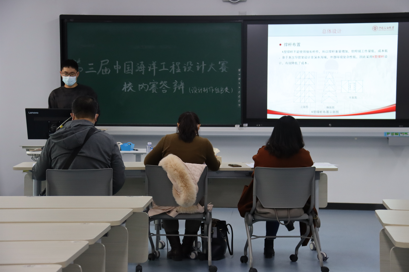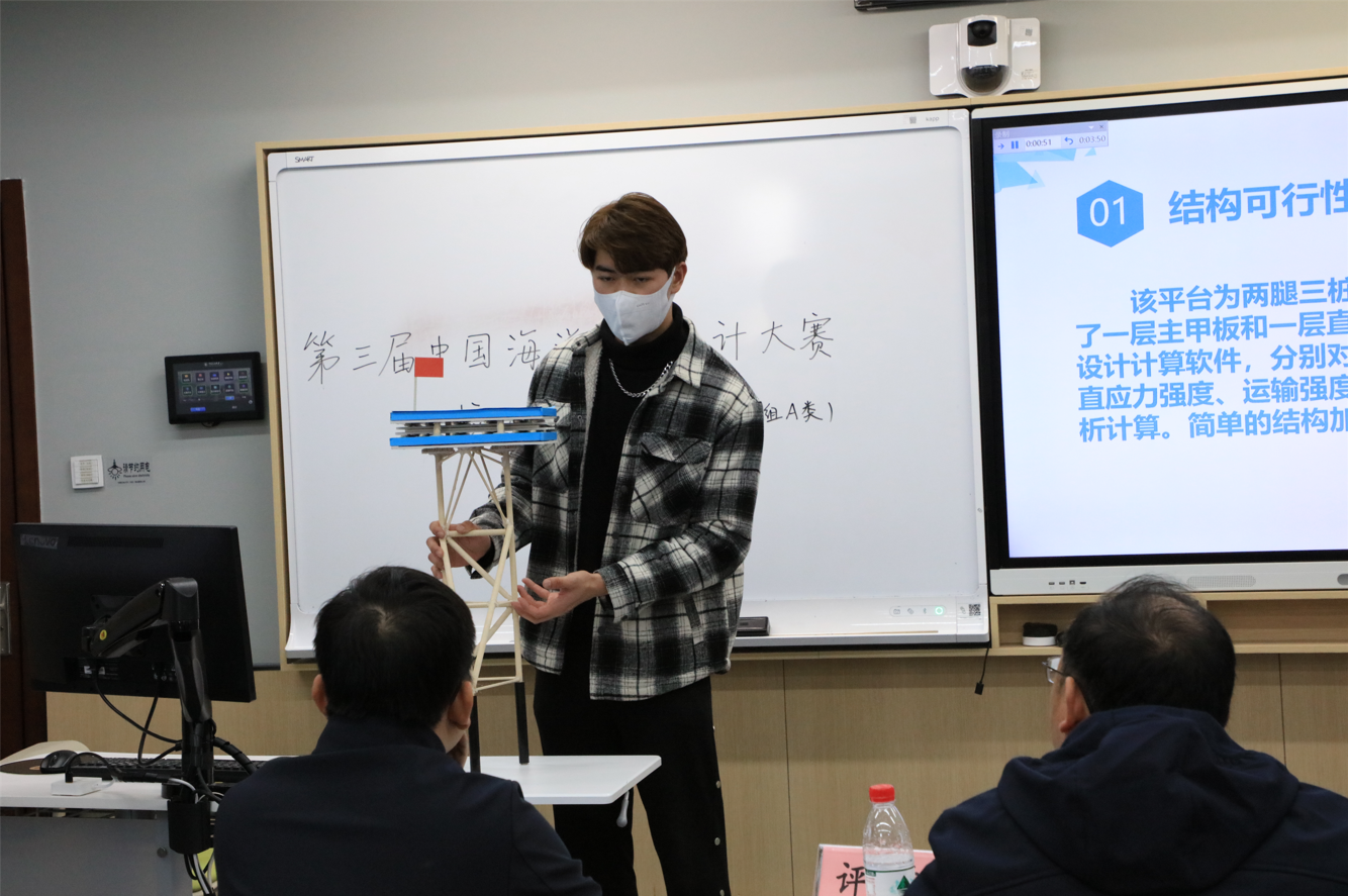 下午,设计制作组A类答辩环节在第四教学楼203室开展。各组选手分别从自身导管架平台模型的设计背景、结构布局、创新点等方面展现自身作品的优势。几位评委老师从基础理念性、创新利用性、现实可行性等方面进行提问,并就不同队伍提出了改进意见。