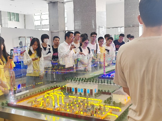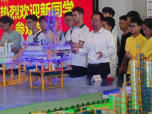 朱益首先对同学们的到来表示热烈的欢迎,随后对教学演示中心作了整体介绍,重点讲解了海洋平台的类型、功能以及海底管道的铺设,并结合测井系统模型,介绍了测井的基本内容和方法。然后围绕“天然气长输管道一体化沙盘”,讲述了长输管线的基本流程和“穿跨越”工艺以及城市燃气输配工艺流程和重要作用。