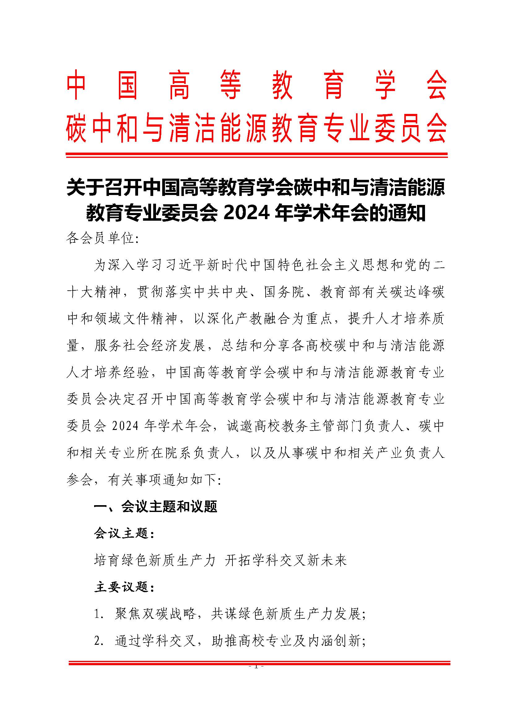 关于召开中国高等教育学会碳中和与清洁能源教育专业委员会2024年学术年会的通知