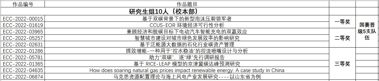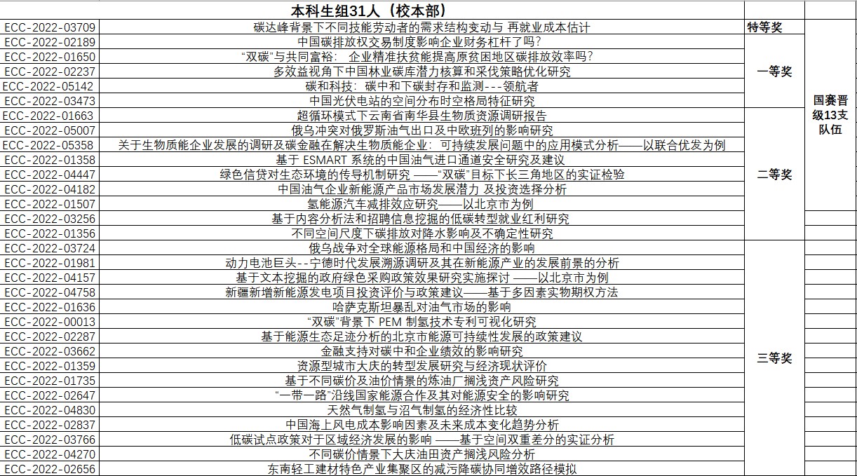 2022年4月10日,第8届能源经济学术创意大赛18赛区比赛落下帷幕(18赛区包括中国免费靠逼视频(北京)校本部及克拉玛依校区)。18赛区比赛总成绩由初赛成绩及答辩成绩构成。18赛区比赛共评出特等奖2名,校本部和克拉玛依校区各1名;一等奖9名,校本部研究生2名、本科生5名、克拉玛依校区2名;二等奖18名,校本部研究生3名,本科生9名,克拉玛依校区6名;三等奖31名,校本部研究生5名、本科生16名、克拉玛依校区10名。校本部推荐18支队伍、克拉玛依校区推荐8支队伍角逐国赛奖项。18赛区获奖团队和晋级国赛的团队如下。
