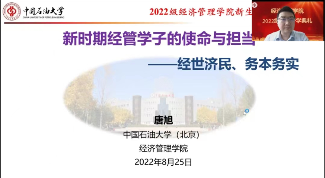 唐旭为典礼致辞,并为全体新生作入学第一堂思政课。他介绍了专业愿景与经管人的使命,勉励大家成为“会顺势、通知识、懂感恩、须独立”的人,并向大家讲解了“厚积薄发、开物成务”的内涵。他希望新生们能够从经济学、管理学的思维去理解疫情防控、双碳战略等国家重大战略,学会从底线思维的角度思考问题。最后,他表示希望同学们坚守经世济民、务本务实的初心,珍惜大学时光,充分历练与成长。