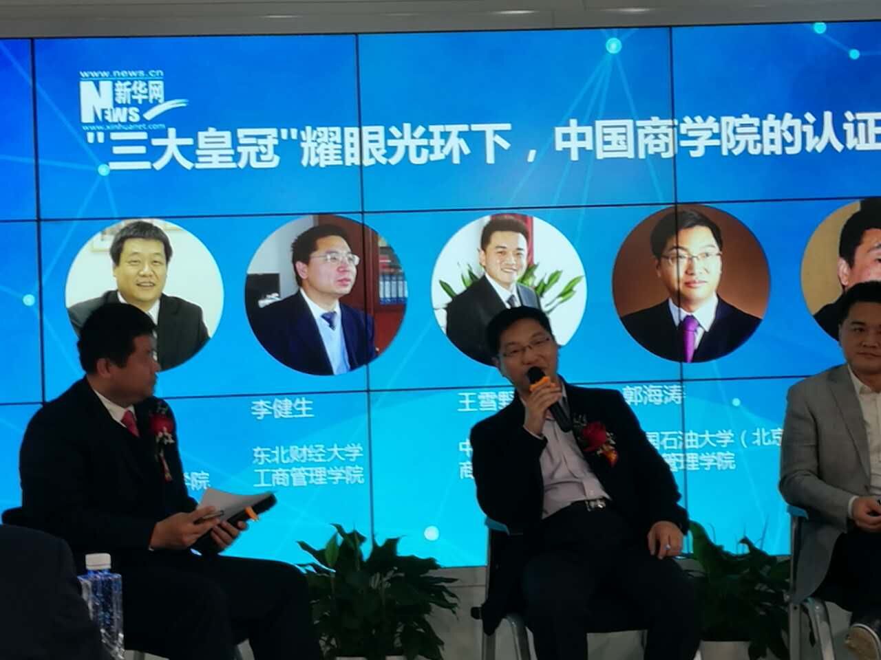4月12日,新华网在北京召开了第二届商学院论坛。此次论坛以“开启商科教育 ‘聚力’新时代”为主题,邀请到国内多所知名商科院校的教育专家、学者,共同探讨在全球视野下国内商学院发展的机遇与挑战。我校工商管理学院院长郭海涛、MBA中心主任金镭出席了此次活动。在圆桌对话环节,郭海涛院长就中国免费靠逼视频(北京)商学院的实际情况和特点探讨了商学院争取国际认证的目的和宗旨,并对国内商学院的认证现状和未来前景进行深入剖析。
