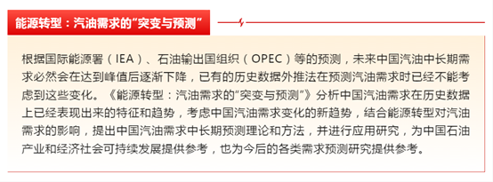 《能源转型:汽油需求的“突变与预测”》是一本突出学术性、紧跟学科前沿、强调创新性的著作。该书以中国汽油中长期需求为研究对象,针对中长期汽油需求预测面临的“外推法失效”问题,全方位地评估了碳减排、污染物排放限制、汽车清洁能源技术、新型能源体系以及数字化等诸多方面对汽油需求的影响,提出了中国汽油中长期需求的组合预测模型,预测了2020年到2060年中国的汽油需求数量,从理论上充实并极大地丰富了“中国能源转型”的内涵及其情景,全面分析了汽油需求的影响因素,理清了影响因素的相互关系和层次结构,构建了基于突变理论的中国汽油需求预测理论和模型框架,并进行了该理论的应用研究。该书认为,中国的汽油需求增长率持续下降,汽油需求系统内部发生了结构性的变化,新能源汽车即将对汽油需求产生更大的规模替代。在此形势下,对当前和未来中国的汽油需求预测研究,迫切需求新的思想、新的理论和新的方法。正是在这一背景下,该书提出的中国汽油需求突变理论、应用范式和预测方法,可以为当前和未来相当长时间,我国能源、石油以及汽车行业的政策研究和制订,为相关企业实施自身的发展战略,提供非常有价值的参考和帮助。