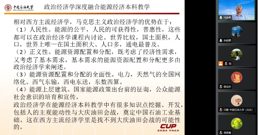 能源经济专业负责人冯连勇教授重点汇报能源经济专业学科交叉型人才培养的基本特征,阐述了能源大数据板块形成的Python、能源数据基础与应用、能源经济环境数据分析方法、能源大数据实践系列课程的特征;并阐述了由专业大赛、学术拓展实践和企业调查与分析组成的第三方评价课程正在学生实践能力培养中发挥重要作用的人才培养特征等问题,并强调了如何将马克思主义经济学融入能源经济本科教学的体系问题。