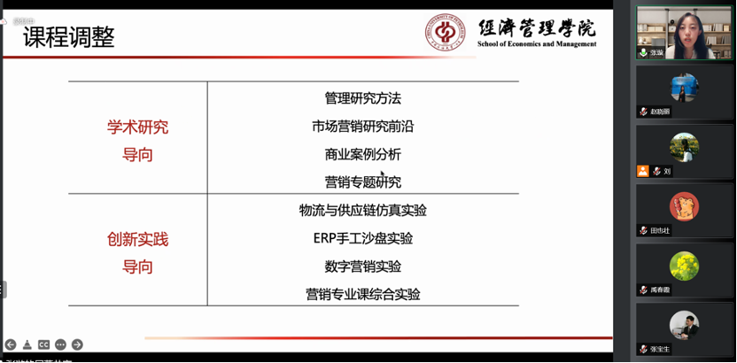 市场营销专业负责人张璇副教授从对一流市场营销专业的调研入手,从专业定位、课程设置、生源、师资和毕业去向等方面交流了自己的思考,提出了市场营销专业培养方案调整的思路,专业定位于培养扎实的方法论素养,培养方向设定为能源与低碳营销和大数据营销两个方向,注重学科交叉,强调导师对学生的个性化指导,设置学术研究方向和创新实践导向课程模块,升学能够对接企业管理博士和商业分析硕士,就业能够对口互联网、创业投资和能源制造。