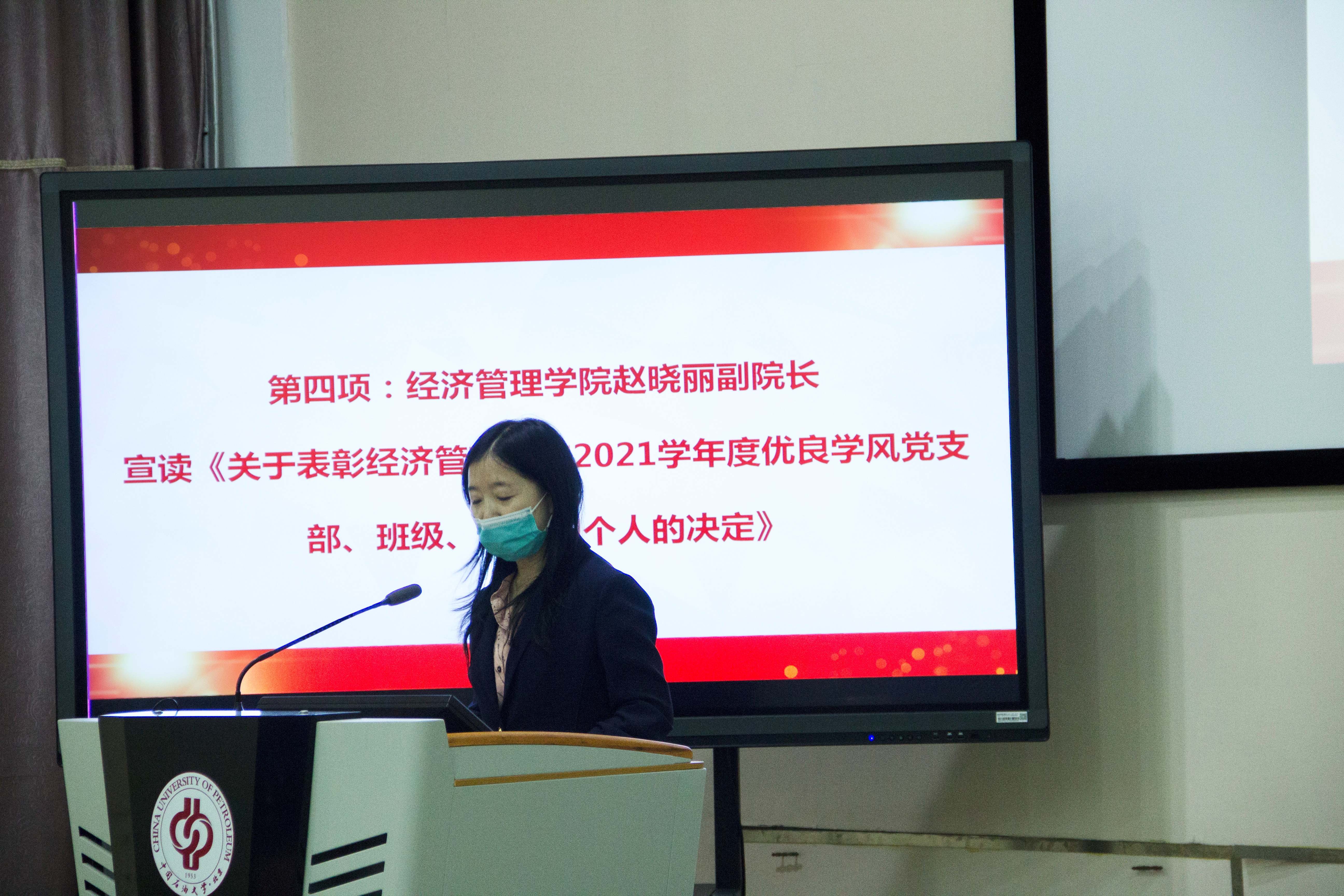 赵晓丽宣读了《关于表彰经济管理学院2021年度优良学风党支部、班级、宿舍和个人的决定》,并宣布了表彰名单,表扬了受表彰的集体和个人。