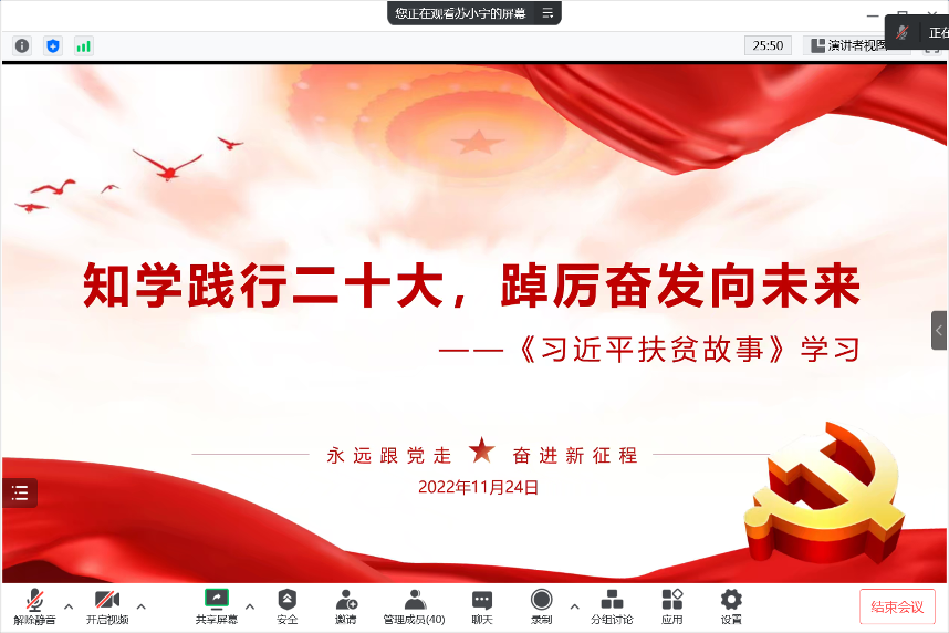 11月24日,为学习践行二十大精神,进一步推动学习型党支部建设,学党史,悟思想,厚植爱国情怀,经济管理学院组织师生支部共同开展“知学践行二十大,踔厉奋发向未来”读书交流主题党日活动。