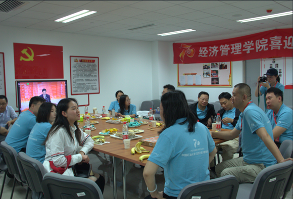 2号上午,李妙兰、杨文慈、钟国晶、穆会珍、陆军、张宝生、邓秀焕、郝洪、回淑玲等退休教师,刘璐、司瑞祺、赵厚学、严振鸣、安彩霞等老校友回归阔别多年的校园,相聚在B1118会议室,与陈大恩、朱义清、马春爱等领导及十余位教师共同观看建校七十周年庆祝大会,共忆难忘的往日时光,共叙求学、工作中结下的美好情谊、共商学院未来发展,为学校七十华诞送上祝福。