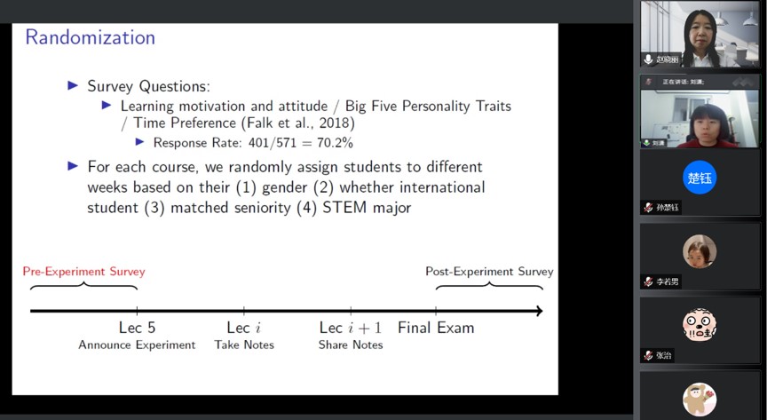 在本次报告中,刘教授介绍了利用田野实验方法研究学生被要求记笔记这种课堂介入手段对于提高学生签到率与学习成绩的作用。她的研究主要是为了回答三个问题:第一,哪个时间段实施课堂介入手段能获得最好的影响?第二,哪一类学生受到课堂介入手段的影响最大?第三,课堂介入手段是否有效?从上述三个问题出发,刘教授首先介绍了田野实验设计,详细讲述了实验分组、实验实施过程与实验问卷等内容,并给出田野实验应该降低实验对象所付出的成本,使其处在一个弱实验情景的建议。在此之后,刘教授介绍了其研究的初步结论,认为课程中段时要求学生记笔记对学生的签到率与课程成绩影响最大,同时非第一时间选课的学生更容易受到这一作用的影响。