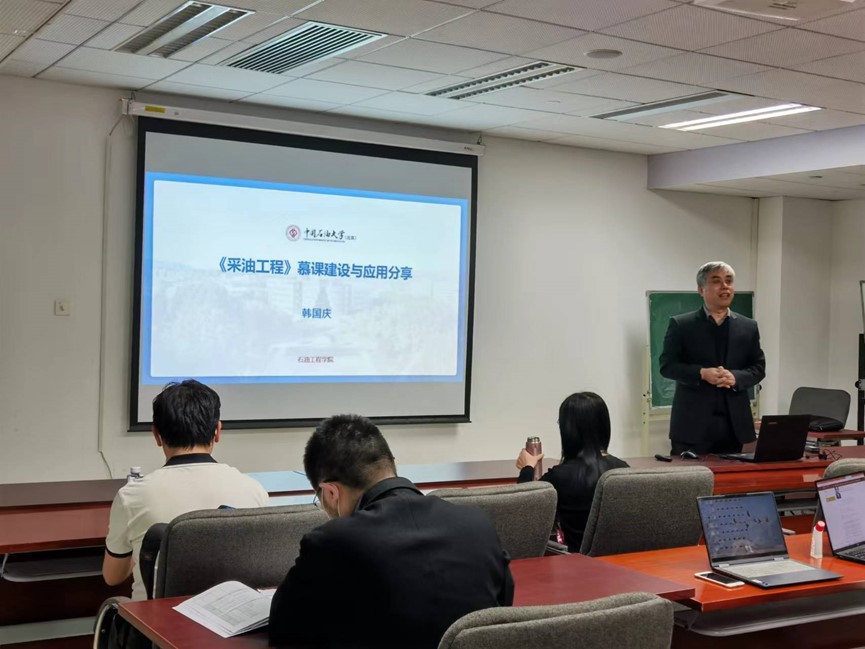 韩国庆老师作了题为“《采油工程》慕课建设与应用分享--慕课建设心得;如何用好慕课;国家级一流课程申报分享”的主题讲座。韩老师从《石油工程》课程的地位、特点和课程建设历程入手,分享了符合慕课特征的碎片化、自助式、随机性课程体系设计思路, 慕课录制PPT+屏幕板书的讲授方式,可以最大程度上还原真实课堂的授课场景;课后习题与期末测试的设计,难度应该由易到难等慕课建设心得;在慕课的使用环节,校内使用方面,韩老师每学期开设6个线上线下混合式课堂,开展“今天我主讲”活动,学生出题,把学生用起来,学生花够时间就可以学好;在社会学习者应用方面,2万多人注册,超70%是社会学习者。最后,韩老师结合一流课程申报体会,对如何结合慕课申报线上线下混合式一流课程进行了分享和交流。