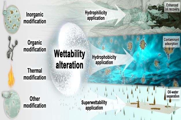 该论文聚焦于材料的孔隙润湿性,总结了润湿性的影响因素(温度、基体的类型和层电荷、改性剂的种类和结构)、测定方法(接触角法和比值法)及其调变方法(无机、有机和热改性等),概述了不同润湿类型在提高采收率、污染物吸附和油水分离中的应用概况,阐明了其作用机理,归纳了润湿性在提高采收率、污染物吸附和油水分离等领域存在的应用问题和挑战并探讨了未来的发展趋势。为设计开发驱油剂、吸附剂以及油水分离材料等新材料提供理论基础,并有望应用于环境保护、粘土矿物、吸附技术、油田开发、纳米技术、界面科学和环境催化等诸多领域。