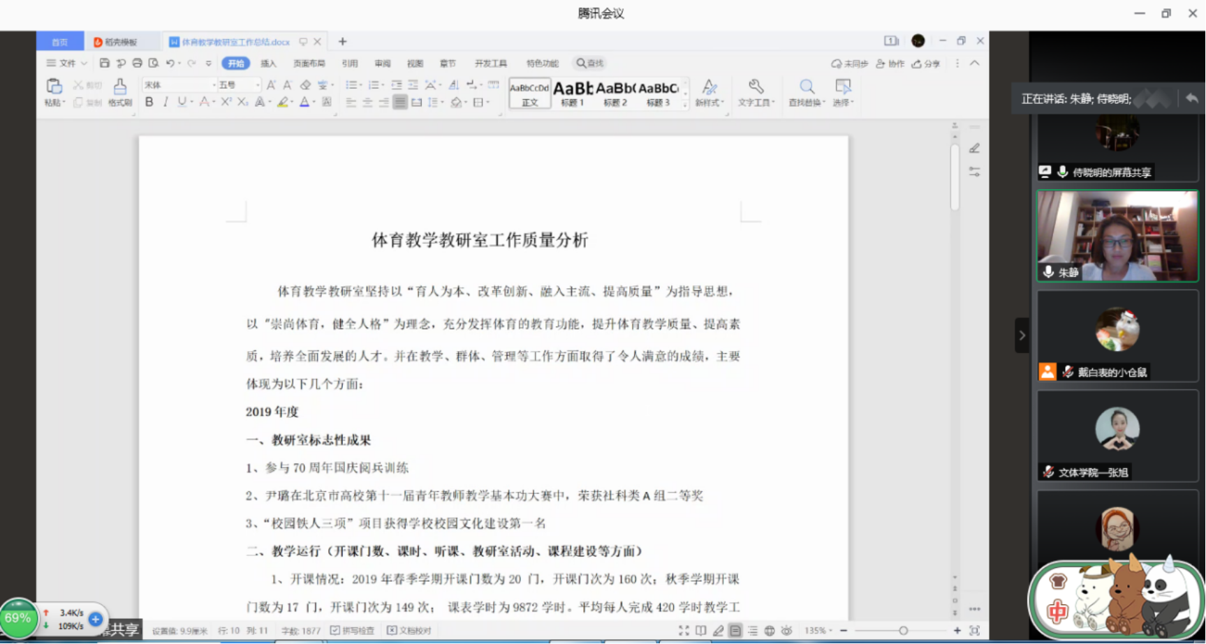 2020年9月27日,体育与人文艺术学院线上召开了2019-2020学年本科教学质量分析报告会,会议由学院教学副院长朱静主持,文体学院全体教职工参加了会议。