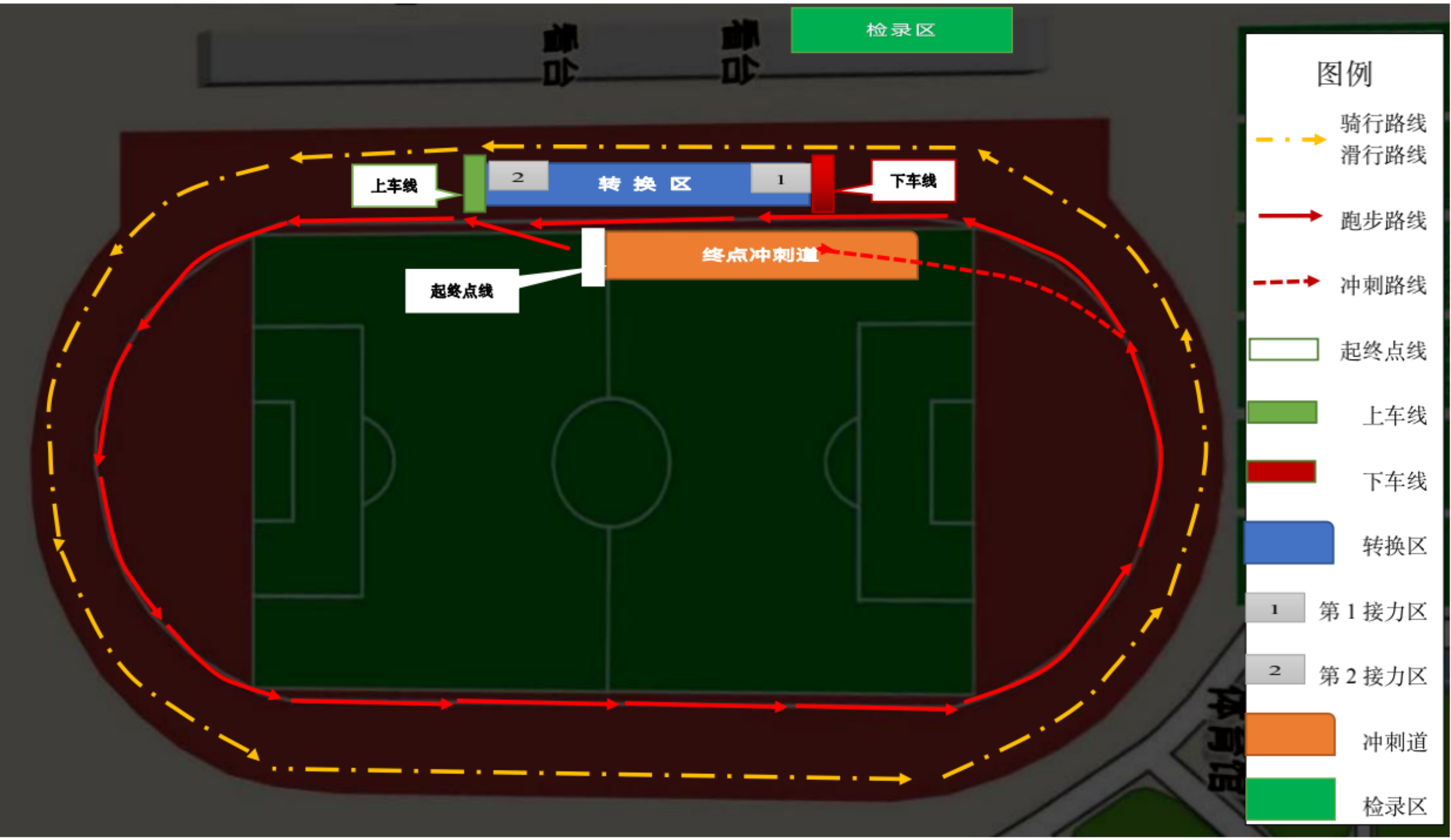2) 小轮车→跑步换项:骑行小轮车至下车线下车,推行至转换区,放车,摘头盔(护具),进入跑步赛段。