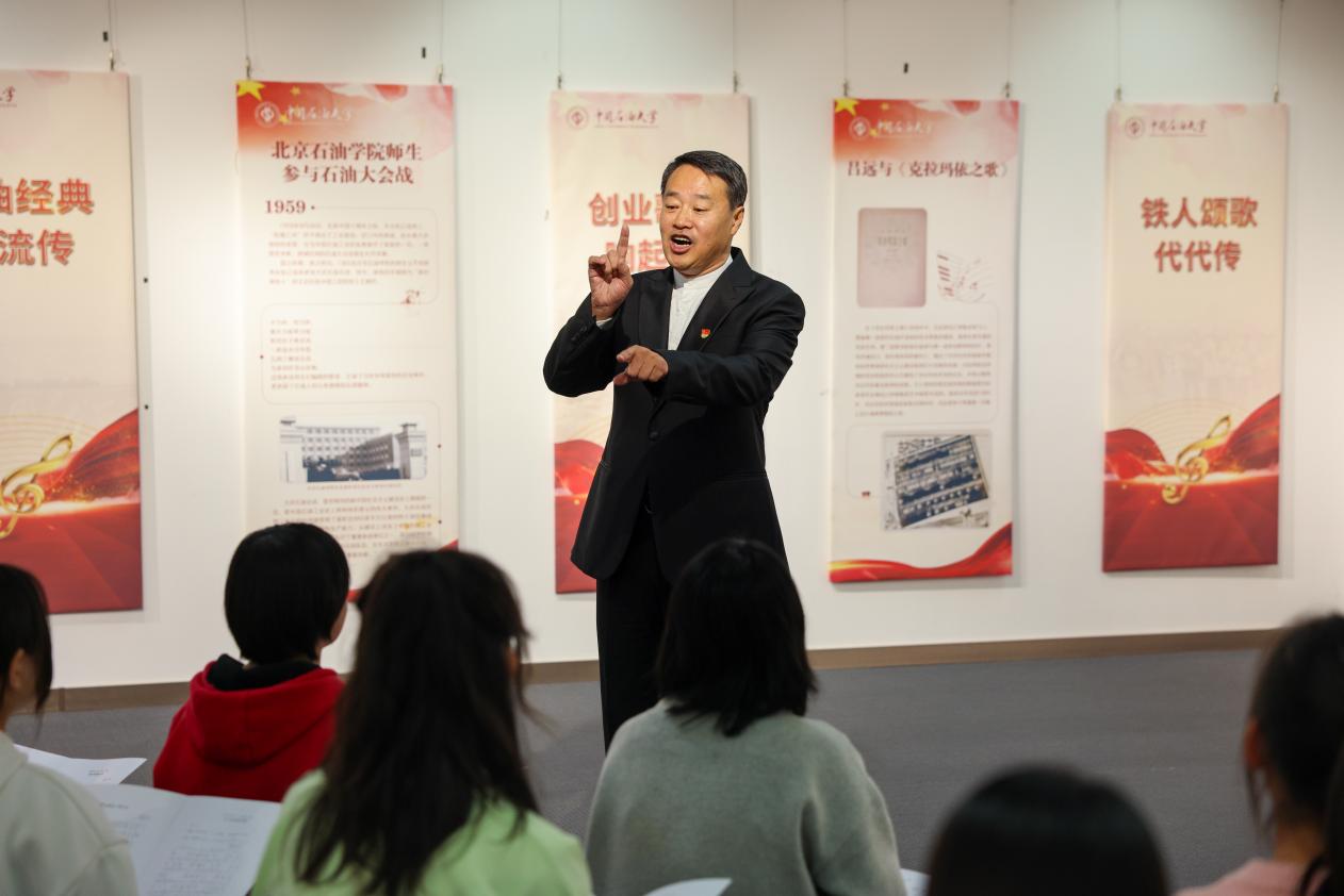 王永桦教授讲授了《踏着铁人脚步走》《我为祖国献石油》这两首经典石油音乐的创作背景、精神内涵,并细致地指导同学们如何将情感管理融入歌唱过程,要唱得准、能唱得稳。