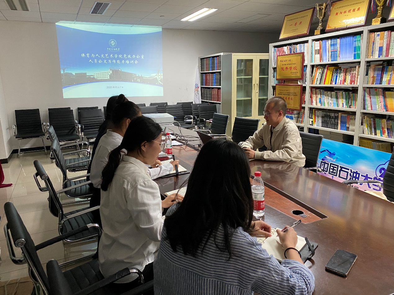 为全面提升学院党政办公室人员工作写作能力,进一步加强党政工作人员队伍建设,10月7日下午,中石大体育与人文艺术学院举办公文写作技能培训,由党委办公室、校长办公室张嵩主讲,学院党政办公室人员参加培训。