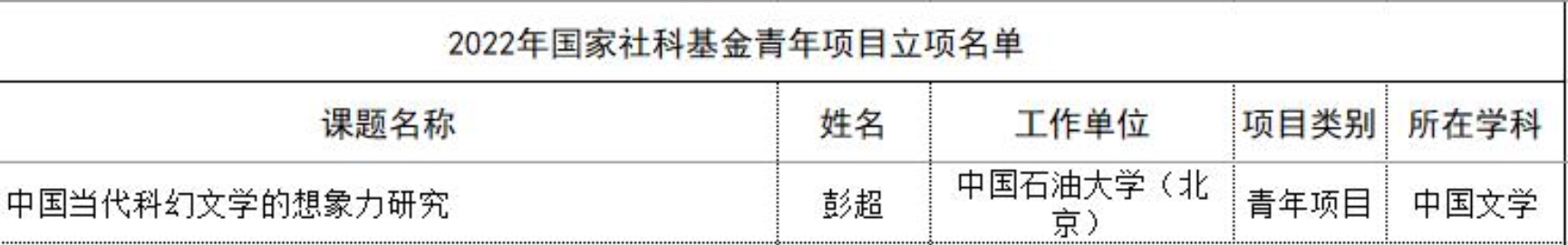 近日,全国哲学社会科学工作办公室网站发布了2022年度国家社科基金年度项目、青年项目立项公示名单,我校今年共获批国家社科基金项目立项2项。我院青年教师彭超申报的《中国当代科幻文学的想象力研究》获得国家社科基金青年项目立项。这是我院首次获得国家社科基金项目立项。