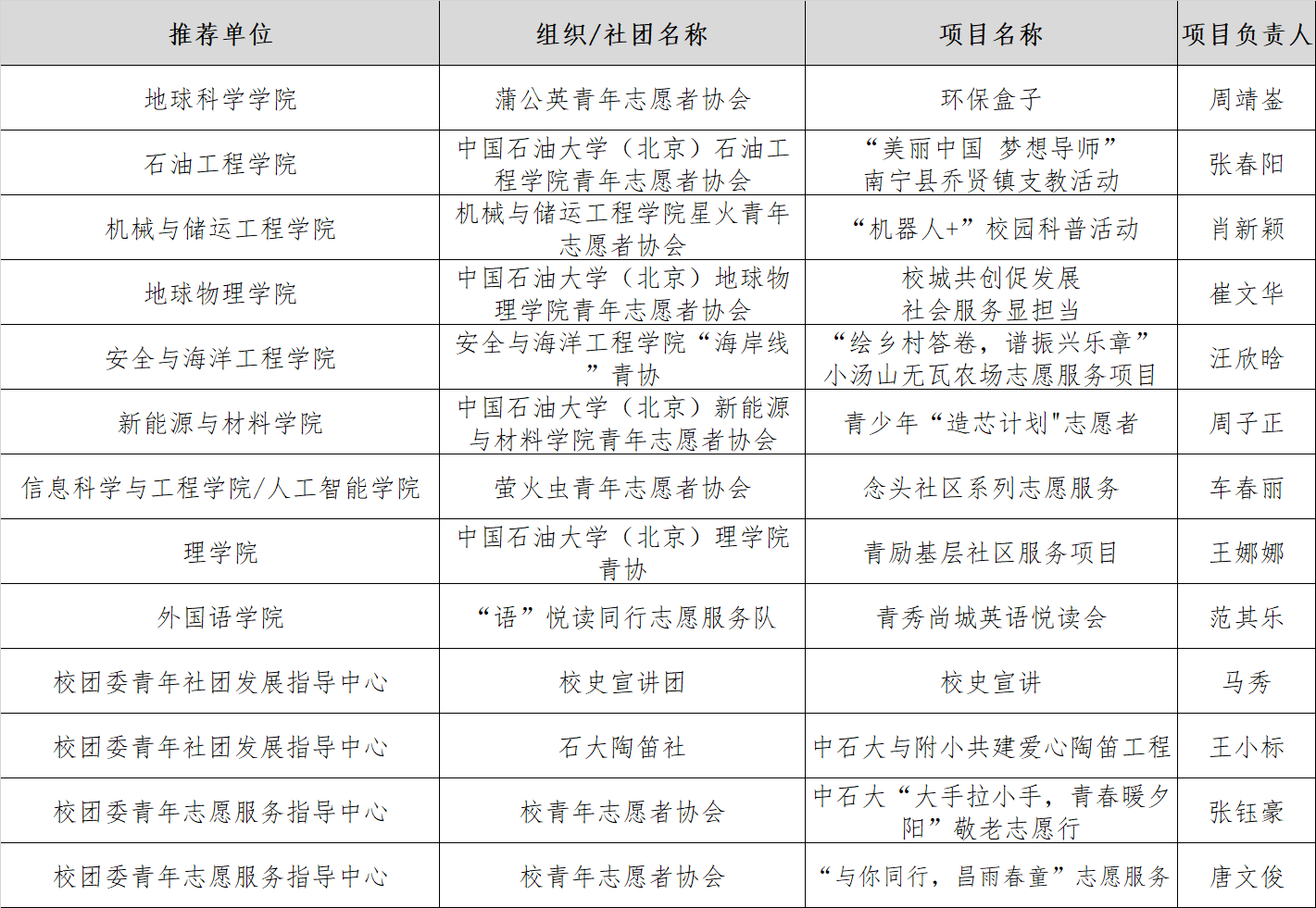 经学生自主申报,各学院(研究院)团委(相关部门)推荐,校团委青年志愿服务指导中心审查推荐材料及相关数据,确定了进入2022-2023年度中石大优秀志愿服务终选答辩的名单,具体如下所示: