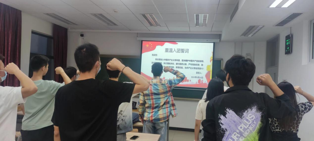最后,全体团员高举右手,紧握右拳,在团支部书记胡梓轩的领誓下,郑重地重温入团誓词:“我志愿加入中国共产主义青年团........”,铮铮誓词在活动室里回荡,团员们表情庄严肃穆,誓词铿锵有力,在这庄严神圣的氛围中,青年团员们接受了一次思想的洗礼和心灵的震撼,引导着他们在接下来的学习、工作中不忘誓言,不辱使命,永葆先进。