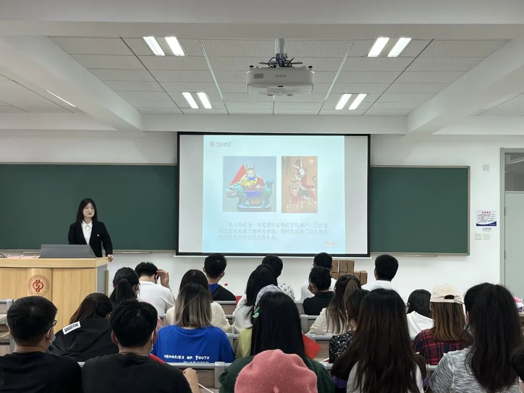 在主持人引导下,同学们分组上台,分享作品并交流心得。有画坐虎兔爷的同学表示,她了解到虎为百兽之王,是统帅者。因此骑虎兔爷象征事业有成,人脉广博,寓意为事业兴盛。还有画麒麟兔爷的,因麒麟吐书的典故而流传的这个兔爷形象,象征着学识广博,学业有成。大家的展示绘声绘色,每个人的兔爷都很有特点,过程中台下掌声笑声不断。
