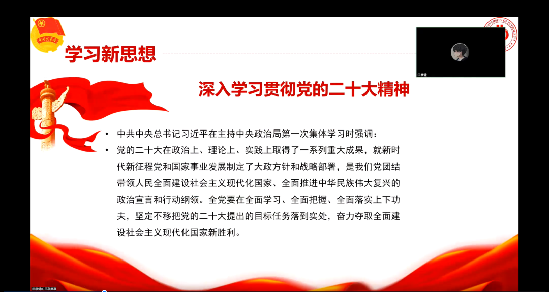 11月5日,研钻井22-1团支部在线上召开二十大报告学习会,团支书田康健从大会主题、三个务必、过去五年的工作和新时代十年的伟大变革、十年来党和国家事业取得的历史性成就、开辟马克思主义中国化时代化新境界和新时代新征程中国共产党的使命任务展开讲解,带领与会团员青年学习了党的二十大报告内容。习近平总书记在二十大报告结尾对全体青年殷切寄语,“广大青年要坚定不移听党话、跟党走,怀抱梦想又脚踏实地,敢想敢为又善作善成,立志做有理想、敢担当、能吃苦、肯奋斗的新时代好青年,让青春在全面建设社会主义现代化国家的火热实践中绽放绚丽之花”。青年一代,生逢其时,号召广大青年团员拥护中国共产党的领导,在党的领导下,为实现中华民族伟大复兴的中国梦而奋斗终身。