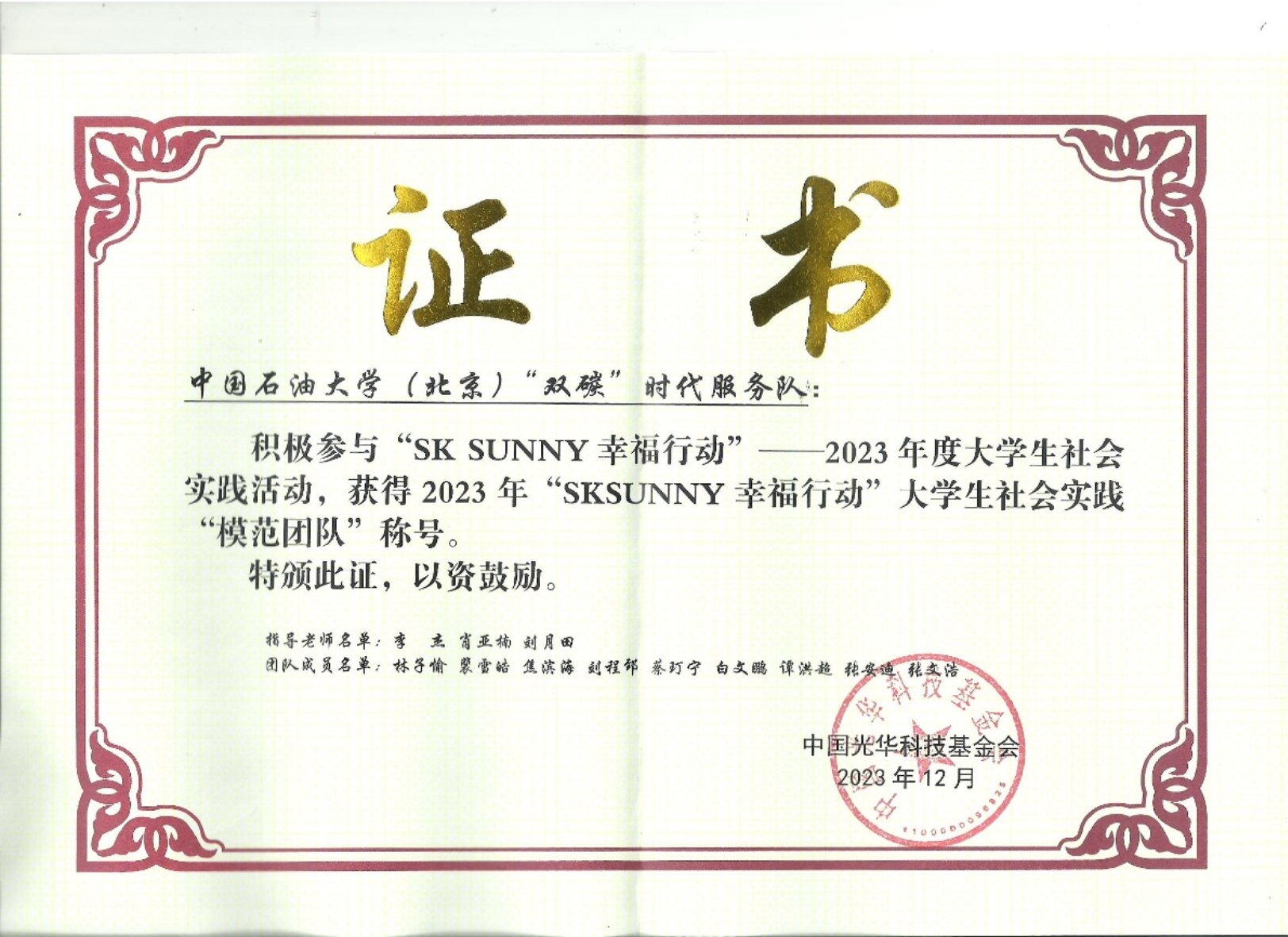 12月22日,由团中央国际部指导,中国光华科技基金会联合SK集团开展的“SKSUNNY幸福活动——2023年度大学生社会实践活动”总结表彰活动在京举办。中石大“双碳”时代服务队入围20强,被评为“模范团队”;团队撰写的案例入选“2023幸福行动优秀案例”。