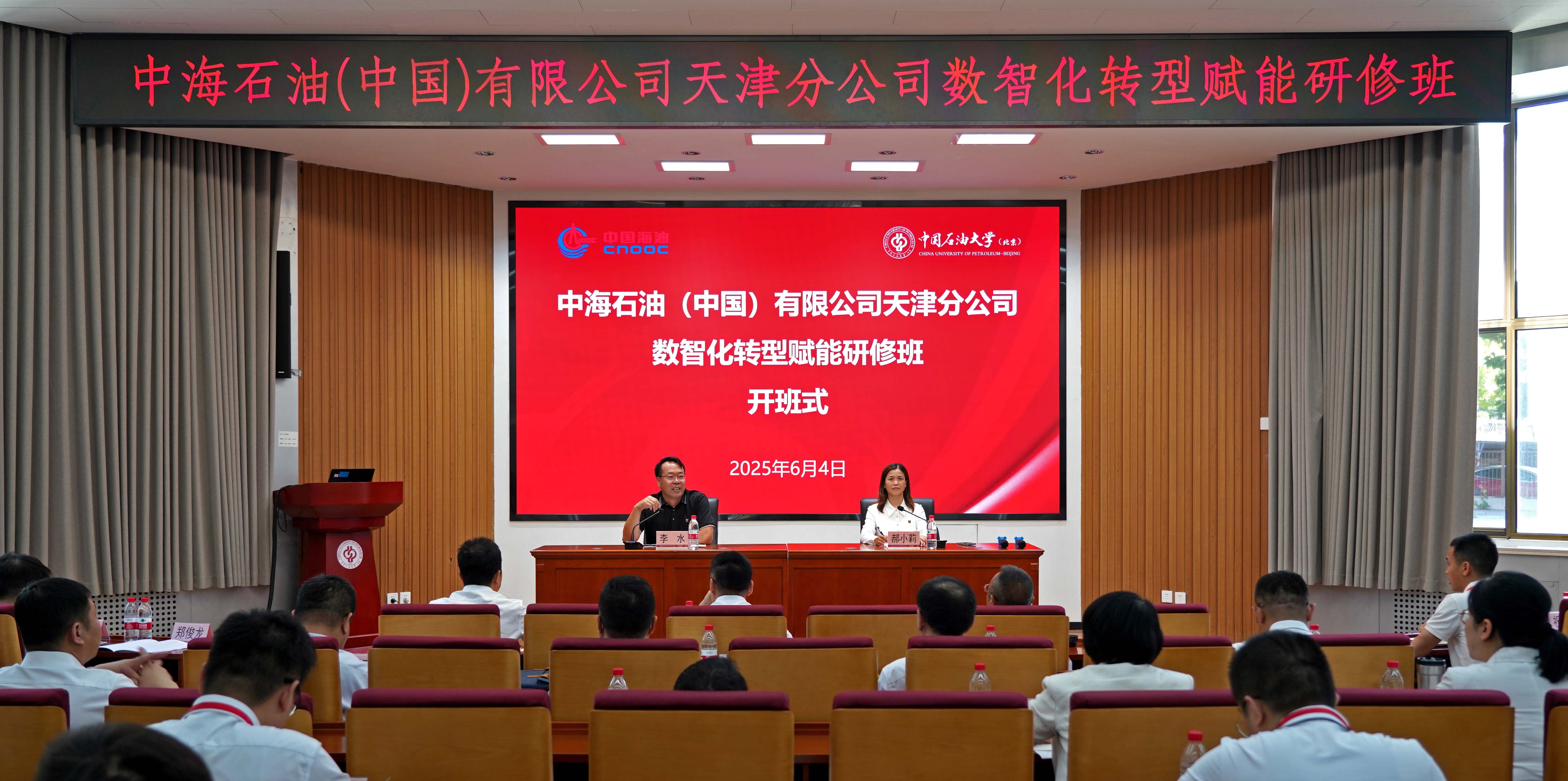 2025年6月4日,中海石油(中国)有限公司天津分公司数智化转型赋能研修班在中石大顺利开班。38名来自天津分公司各相关单位的业务骨干参加本次培训,我院副院长李水出席开班式并致辞。