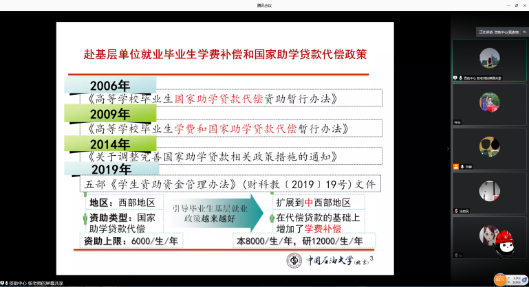 为帮助2020届毕业生了解国家基层就业学费补偿补偿贷款代偿政策,扎实做好我校毕业生基层就业学费补偿贷款代偿工作。6月10日,学生资助管理中心采用腾讯会议形式举办2020年毕业生基层就业学费补偿贷款代偿政策宣讲会。学生资助中心全体人员、各学院(研究院)资助负责人、毕业班辅导员及200余名2020届毕业生参加了会议。