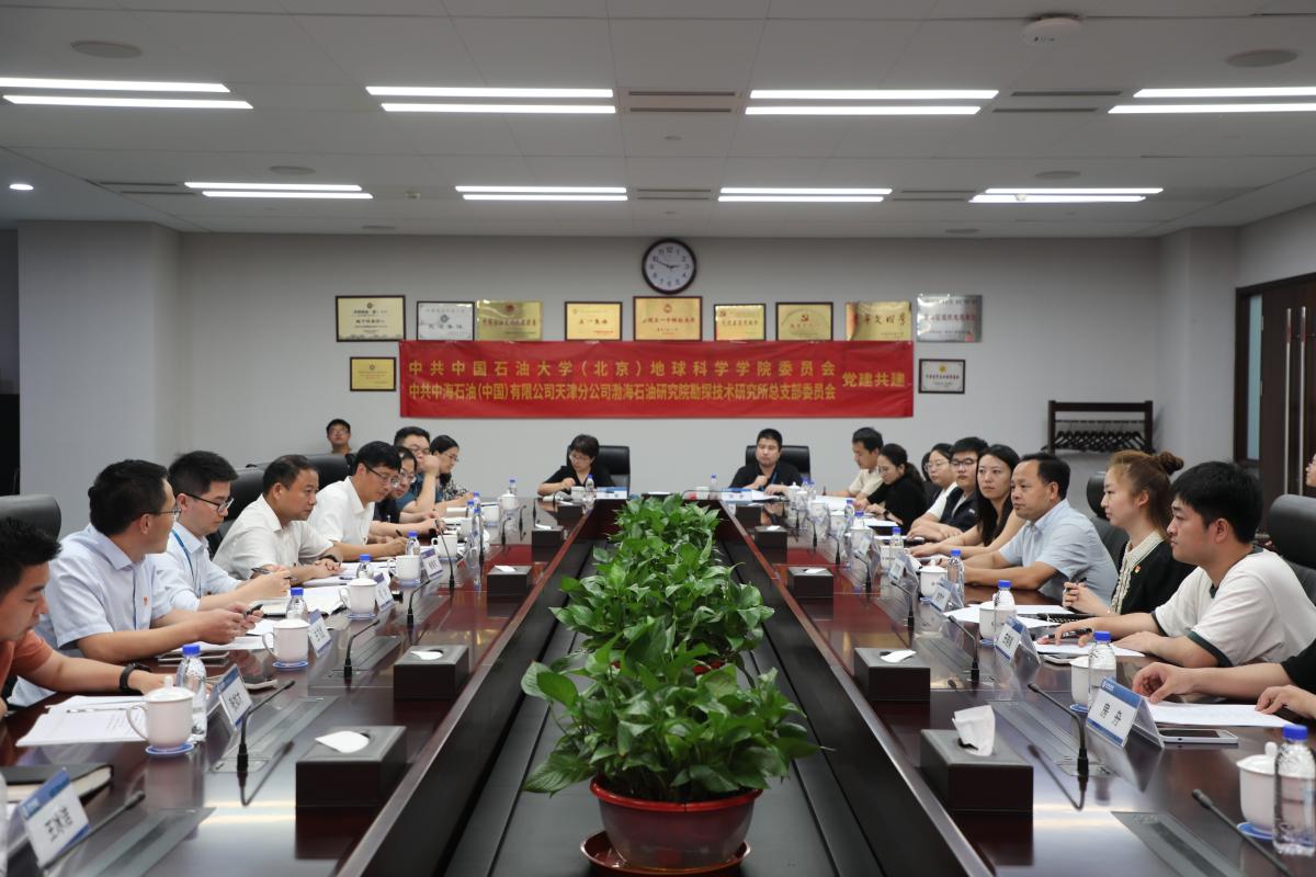 为全面贯彻落实习近平总书记关于能源安全新战略重要指示批示精神和科技创新的重要论述,深入推进党纪学习教育,创新党建活动载体,不断推动党建与科研深化融合,7月16日,中石大地球科学学院赴中海石油(中国)有限公司天津分公司渤海石油研究院勘探技术研究所开展党建共建活动,签署党建共建协议和地球科学科普教育基地暨大学生社会实践基地共建协议书,并为基地揭牌。